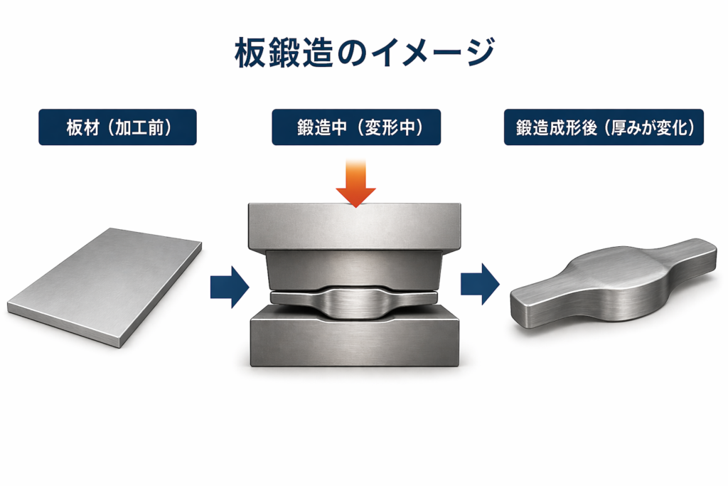 板鍛造と聞いても、初めての方は少し難しく感じるかもしれません。 板鍛造とは「平らな金属の板をプレス機に入れ、金型の中で部分的に分厚くしたり、複雑な形に変えたりする加工方法」のことです。